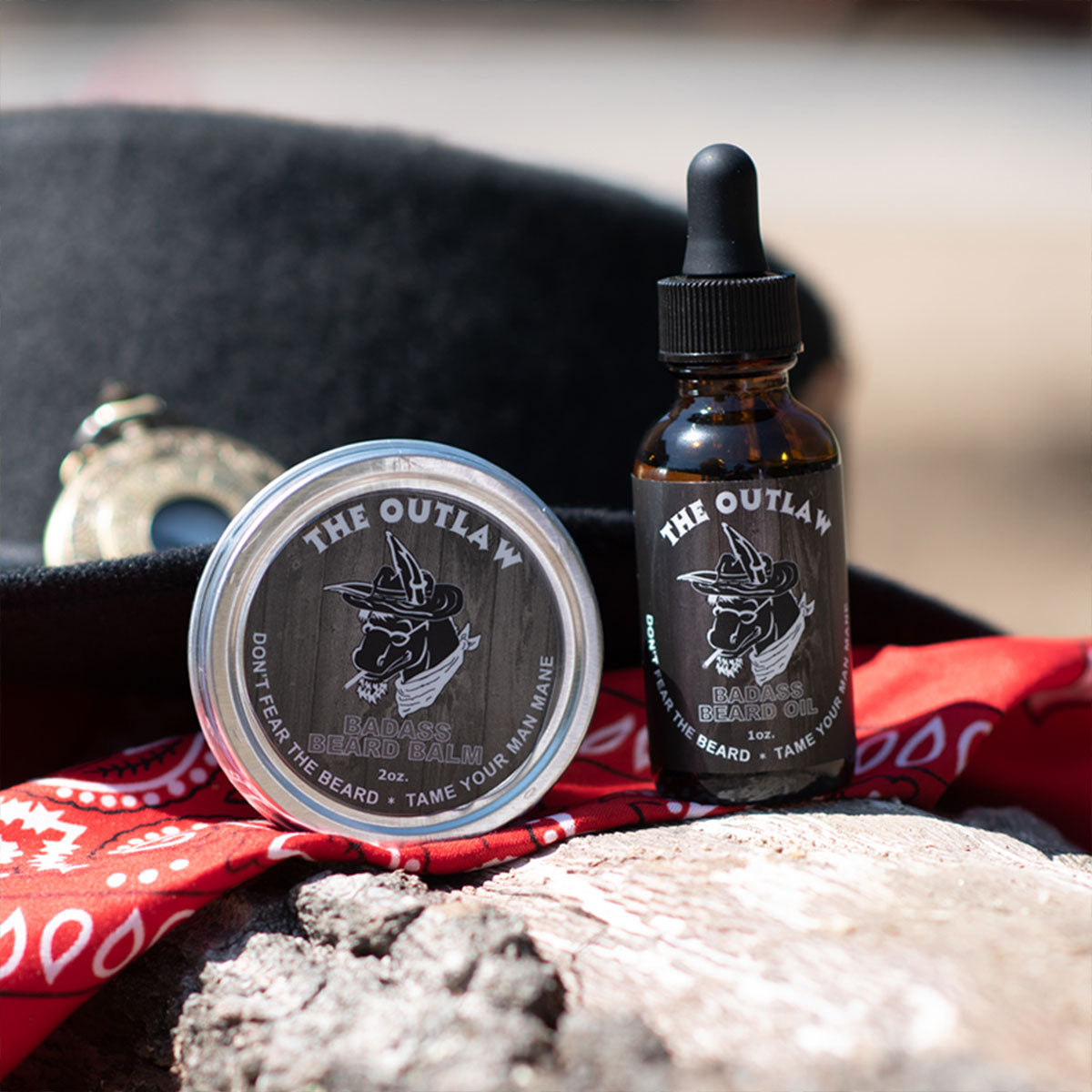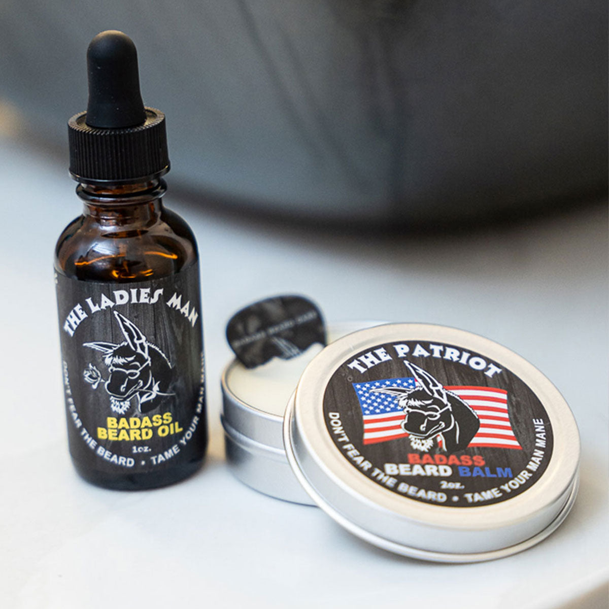 One 2oz Badass Beard Balm or Beard Wax or 3oz Beard Butter(+$5.00) and one 1oz Beard Oil of your choice (you can mix and match!), packaged in a black velour gift pouch!