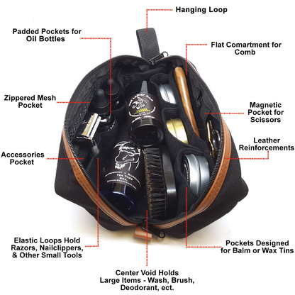 Whether you're always on the road for work and need a durable, feature-loaded Dopp kit or just need some organization and protection of your products, this Canvas Travel Bag with Leather Accents has got you covered. We’ve spent the hours and invested the R&D to meticulously perfect this bag to carry all of your Badass goodness - from padded pockets sized perfectly to fit and protect your oils, balms, scissors and combs, to elastic straps and zippered compartments to organize other toiletry essentials while traveling. And with room to spare in the main compartment for your 8oz Beard Wash bottle, Badass brushes, and deodorant and a lifetime warranty to boot, you won't ever need another toiletry bag again! So pick up one of these Badass Canvas Travel Bags today, and enjoy that extra feeling of awesomeness knowing this bag will be Badass forever.