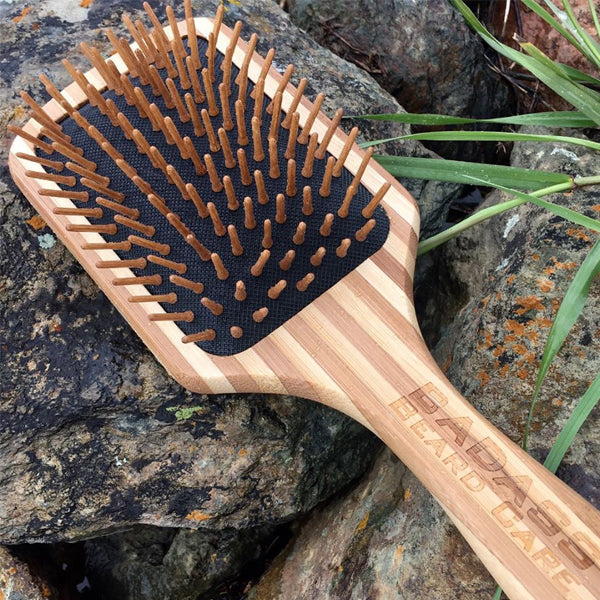 The Wood Bristle Beard Brush takes brushing to a whole new level and allows you to brush your beard out while it's still wet! The bamboo bristles are anti-static and they are bowed out and placed inside an air pocket to allow the bristles to flex, which gets tangles and knots out without pulling hair out. The frame and handle are made from bamboo for a lightweight feel. The logos are laser engraved for maximum durability.