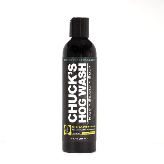Chuck's Hog Wash is an all natural daily wash for your beard, body, and hair. It is gentle enough for all skin types and will leave your skin and hair soft and healthy. It is available in all of our regular oil and balm scents.